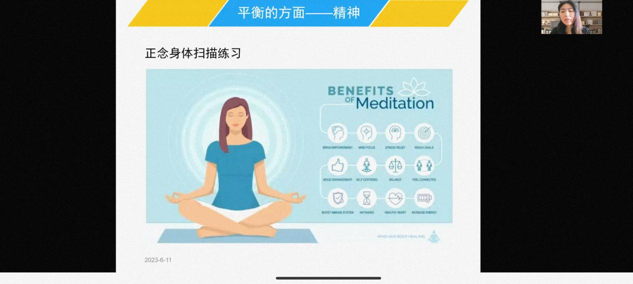 吕慧平师姐也分享了她在工作生活中遇到了那些失衡的情况,后面做到平衡的经验,很有效的方法之一就是给自己10分钟的冥想,生活中要做到饮食睡眠规律,要有一些适当的运动锻炼,保持健康的体魄。