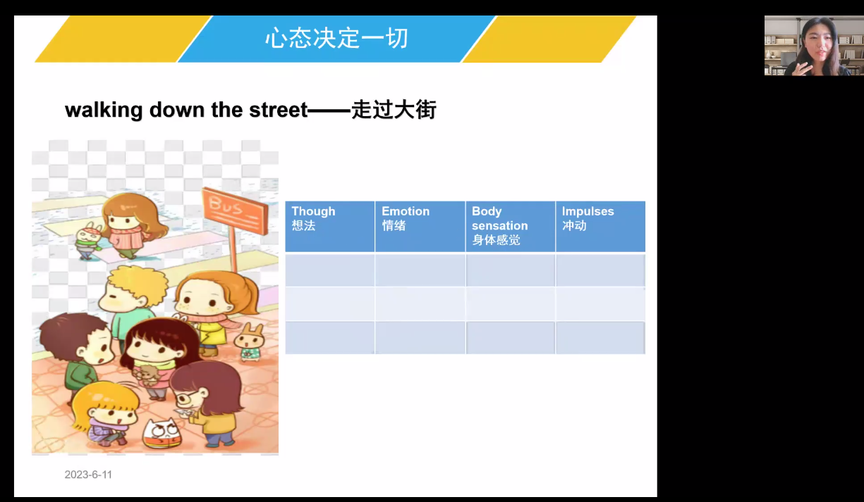 师姐说道,可能在每个人当中,他的理解是不一样,我们就是以一个积极的方式去对待事情,我们只是针对事情的本身,不要深挖。我们要记得我们的心态是决定一切,你的想法是决定一切的!我们能改变的只有我们自己,自己去适应我们的环境。师姐还向我们介绍了形成积极心态的三要素:1.多与人沟通:2.快乐是我们自己送给自己最宝贵的礼物;3.工作是美丽的。