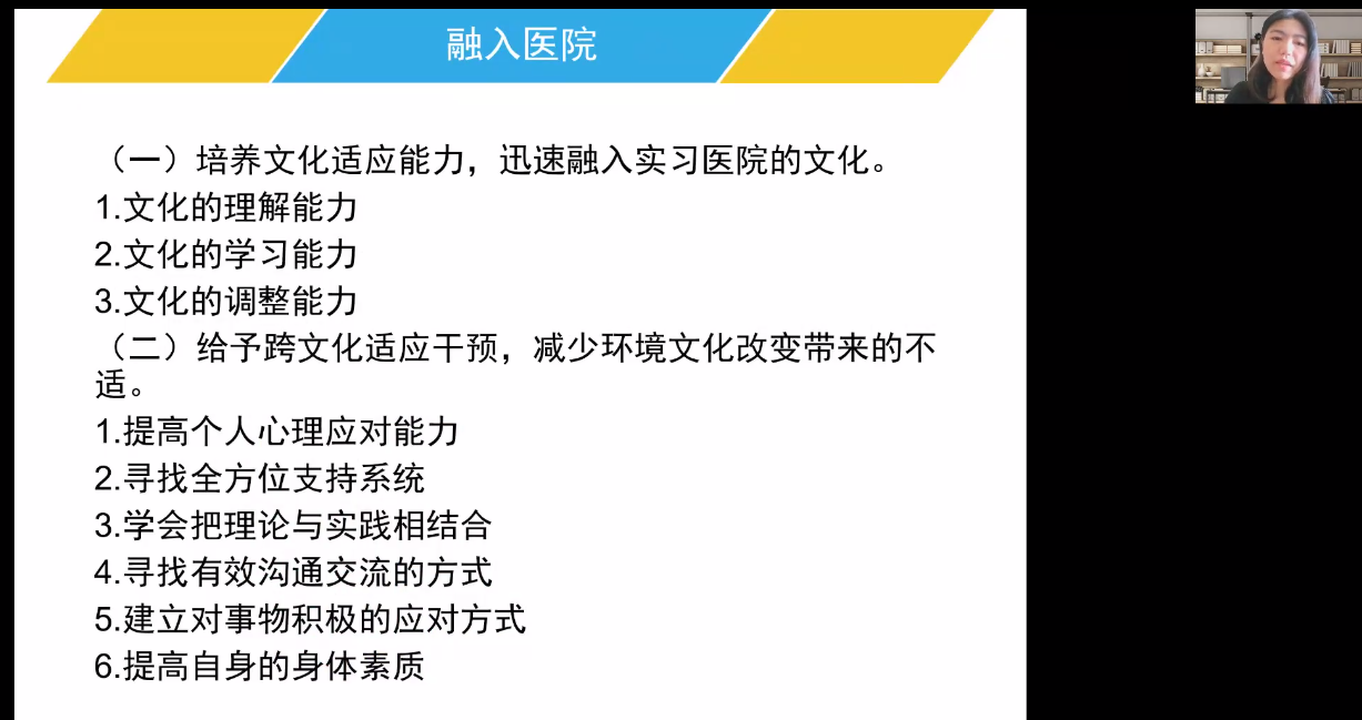 师姐还从培养文化适应能力,迅速融入实习医院的文化、跨文化适应干预、建立良好的人际关系:对医院所有的工作人员都要保持友好亲切的态度、遵守实习医院规章制度工作,保障医疗安全、遵守操作流程规范操作,保障个人与患者安全等几个方面做了分享。