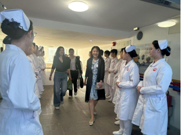 上午9:00,学生们身着整洁的服装,精神抖擞地在实训中心门前整齐列队迎接省二医护理部的郑文护长、刘玲中护长以及陈慈瑞老师的到来。