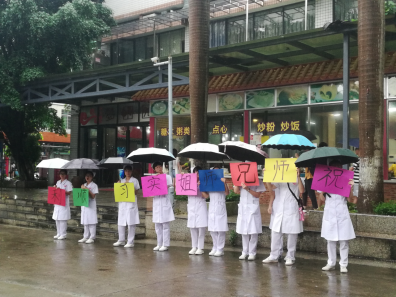 2019年6月24日早上七点半,2017级的师弟师妹们已经站在生活园的校道上,等待着收拾好行李的师兄师姐。2017级有的同学去帮忙搬行李,宋建玲老师也过来帮忙,鼓励他们不要紧张。雨,淅淅沥沥地下着,但挡不住2017级学子欢送的心,也挡不住2016级学子寻梦的心。8:30去中山大学附属第八医院实习的大巴缓缓驶出校园,站在校道上的学子高举着:“祝师兄师姐实习顺利!”