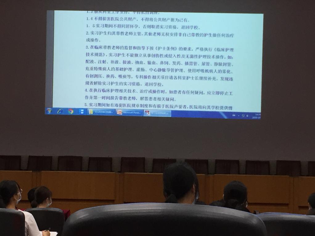 报到当天,佛山市第一人民医院护理部对全体实习生进行了岗前培训。医院护理部辛丽娜带教老师首先向实习生们介绍了医院的地理环境、医院辉煌的历史以及未来发展方向;接着宣读了医院实习的科室分配安排和实习生的管理规定。