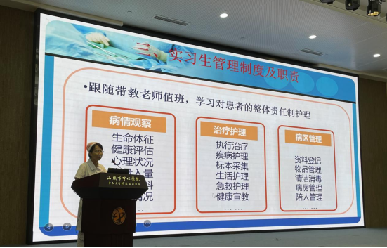 7月4日,5位实习生全体参加了岗前培训大会,培训内容主要包括实习生管理制度及职责、医院感染防控技术、护理礼仪规范和沟通技巧及实习生安全管理。