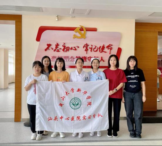 图为5位实习生与汕头市中心医院护理部老师的合影