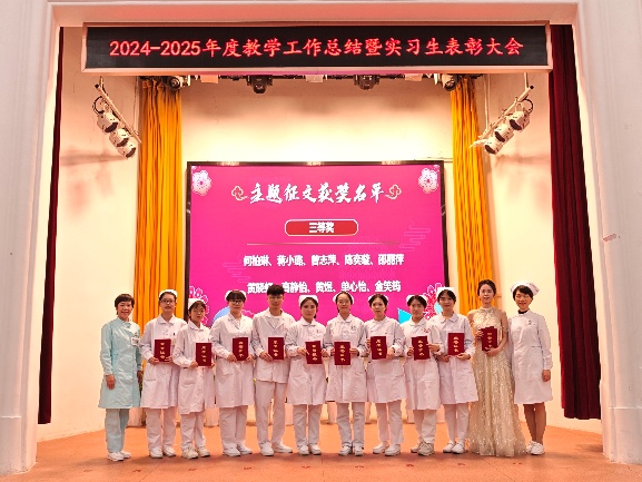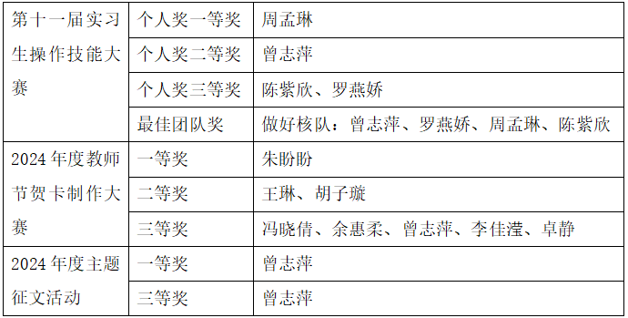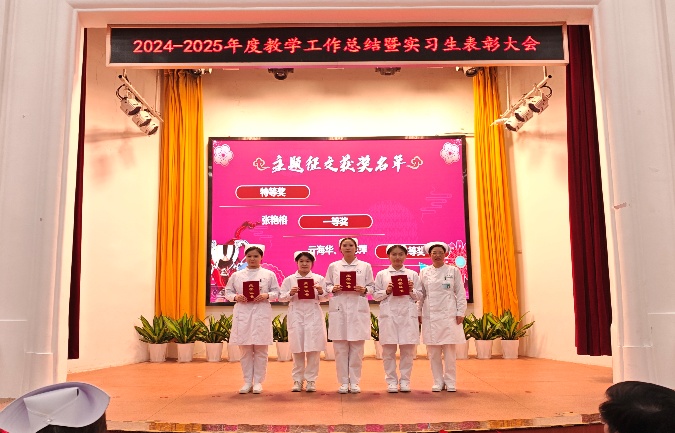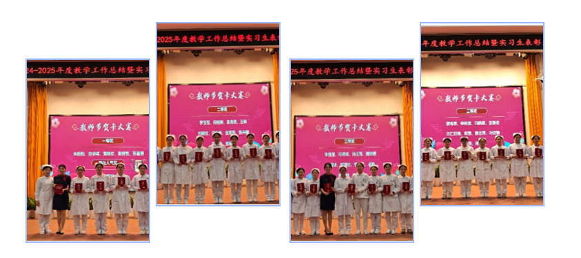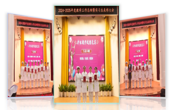 接下来,迎来了大会的高潮环节——优秀实习生表彰仪式。经过层层筛选和综合评定,一批在实习期间表现出色的实习生脱颖而出。我们的新华学子怀揣青春热情,在一次次刻苦学习、反复练习下,通过细致观察、温柔守护、从容不迫,在各项评比和竞赛中取得了优秀的成绩。朱盼盼、黄飞雪、冯晓倩、罗燕娇、曾志萍、张晴、李佳莹等7位同学获评“优秀实习生”。在第十一届实习生操作技能大赛中斩获个人一等奖、二等奖各1名,三等奖2名,同时凭借出色的团队协作和专业表现荣获最佳团队奖(共3支获奖队伍)。在教师节贺卡制作大赛中,斩获一等奖1名、二等奖2名、三等奖5名,在主题征文活动中,曾志萍同学凭借真挚的情感和优秀的文字功底取得一等奖和三等奖。