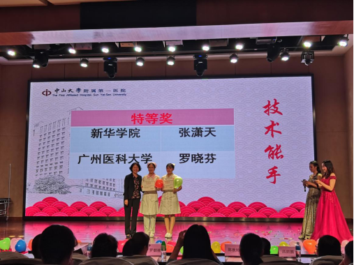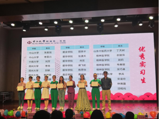 大会最后,表彰了优秀的实习同学,我院张潇天同学获得技术能手特等奖,李艳芬同学获得三等奖。同时,张潇天、肖宜、梁飞虹、陈思怡四位同学分别获得了中山大学附属第一医院优秀实习生荣誉称号