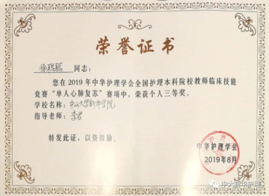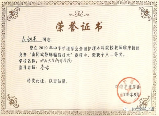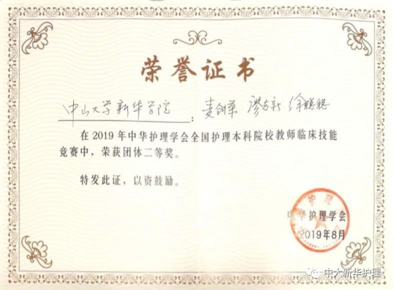 2019年8月2日,中华护理学会全国护理本科院校教师临床技能大赛在福建省福州市举行,此次大赛由中华护理学会主办、福建省护理学会和福建医科大学协办。通过各本科院校永利集团3044欢迎你报名,省、市、自治区护理学会组织选拔,共有来自全国92所护理本科院校的276名护理教师参加了大赛。我校永利集团3044欢迎你代表队参加了三项技能操作比赛,最终获得团体二等奖,个人二等奖2项、三等奖1项的佳绩。