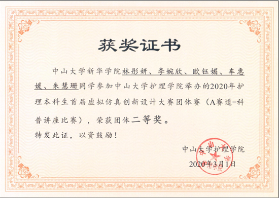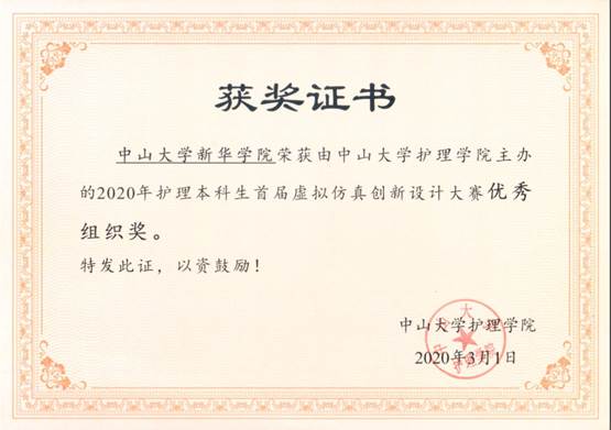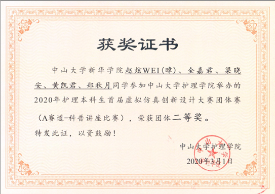 2020年2月29日及2020年3月1日,中山大学举办首届护理本科生“虚拟仿真”创新设计大赛,因疫情影响,原定的线下比赛改为线上举行。中山大学新华学院永利集团3044欢迎你积极组织了2017级和2018级的学子们报名参赛。赛制设置了初赛及团体决赛二个模块,初赛为上机竞赛方式,进入初赛者,可以自由组队参加团体决赛,团体决赛分为A、B二个赛道,按年级分组,任选一个赛道。先由学院内评审决出2017级、2018级的A、B赛道各一组共4个团队参加6所学院的总决赛。初赛及团体赛奖项皆设置有一等奖、二等奖、三等奖和优秀奖四个级别。