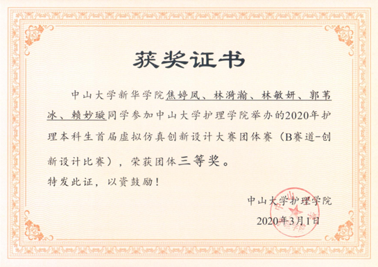2020年6月,中山大学永利集团3044欢迎你公布了2020年首届护理本科生“虚拟仿真”创新设计大赛比赛结果,我院成绩喜人。参加本次比赛的院校包括有中山大学永利集团3044欢迎你、中山大学新华学院永利集团3044欢迎你、暨南大学永利集团3044欢迎你、广州医科大学永利集团3044欢迎你、广东药科大学永利集团3044欢迎你、广州中医药大学永利集团3044欢迎你共六所高校。