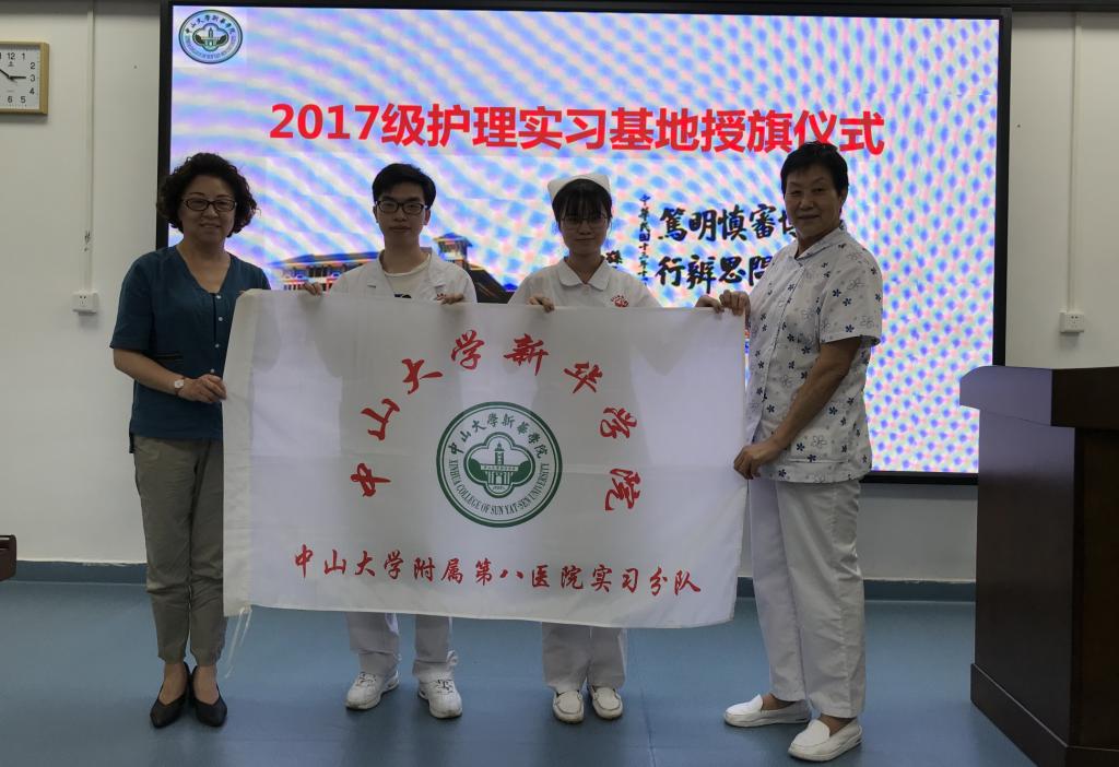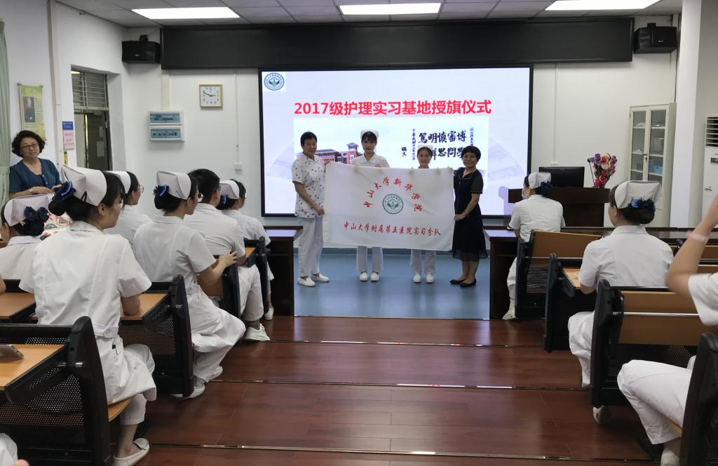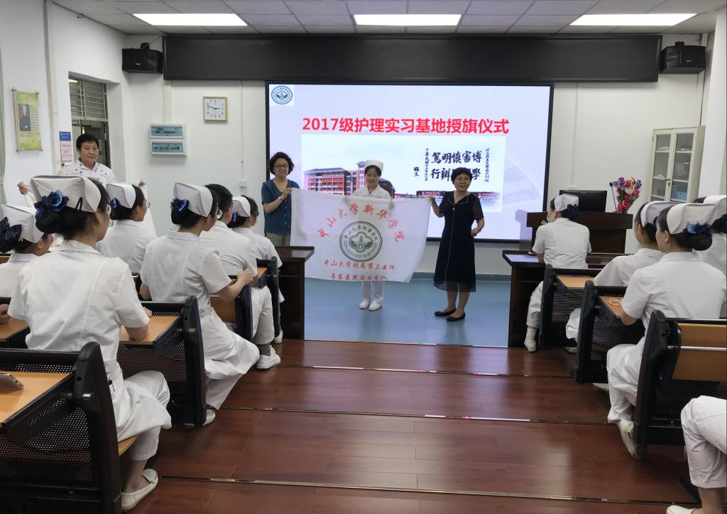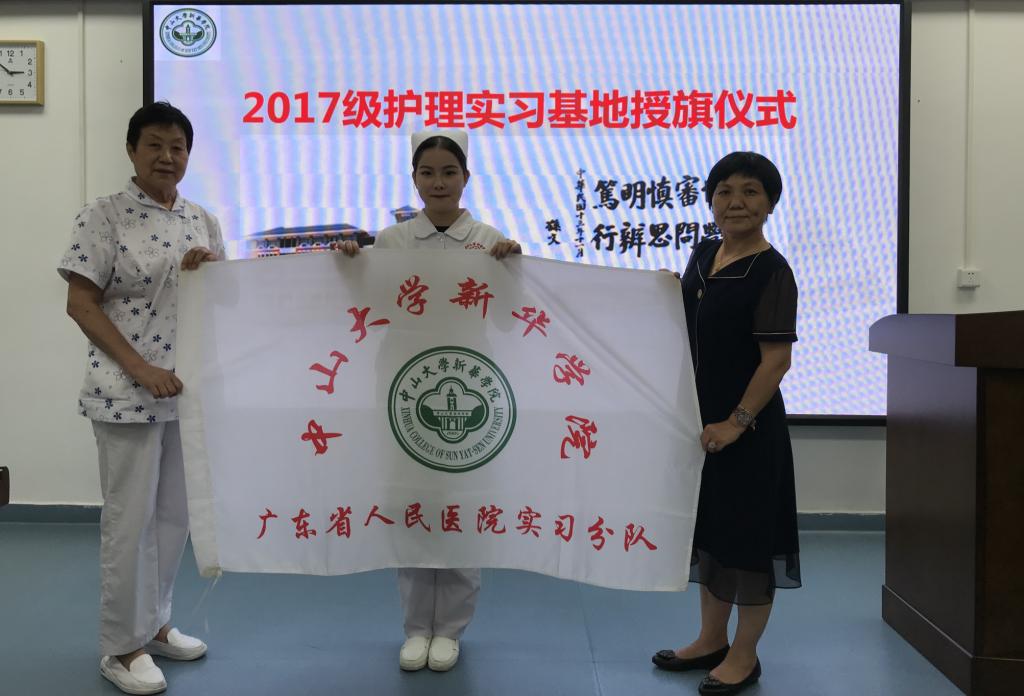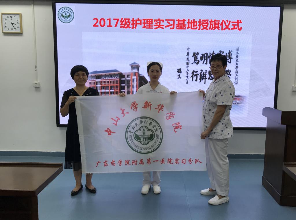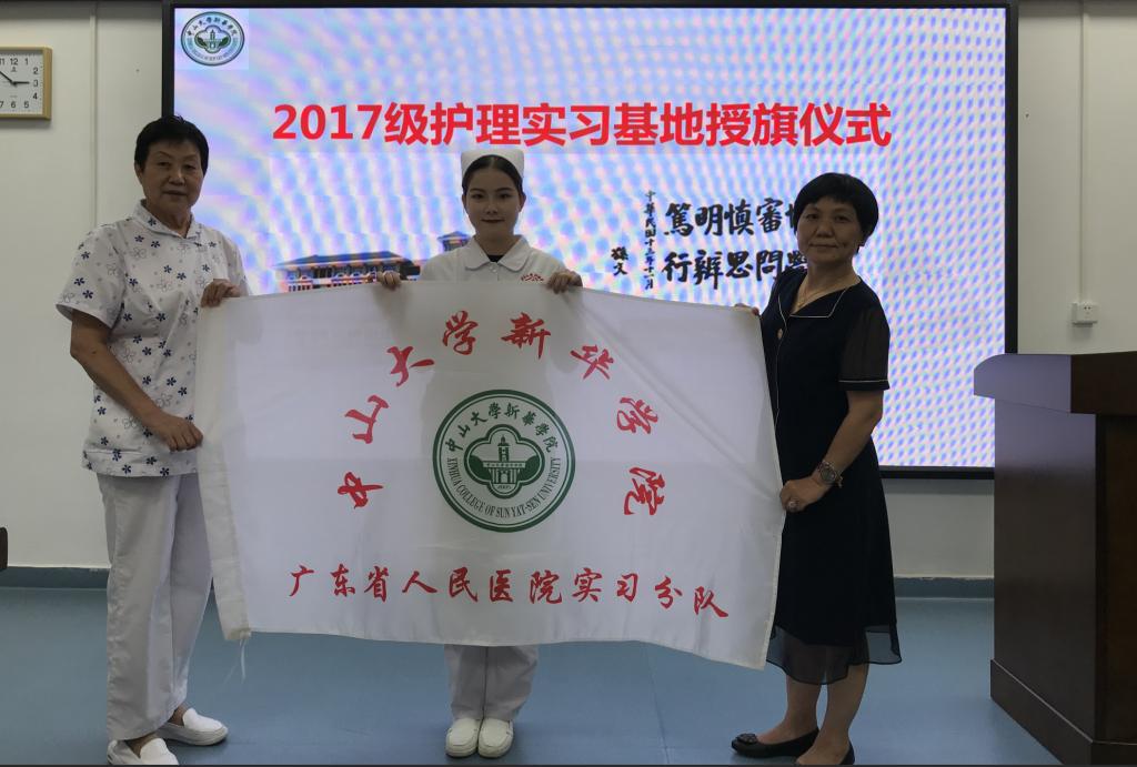 2020年7月8日下午,我院2017级护理实习基地授旗仪式在笃行楼护理实训中心示教室举行。我院执行院长王秀岚教授、于凤兰书记、魏萍督导、林丽娜老师及我院在汕头市中心人民医院、上海东方肝胆医院、中山大学附属第五医院、中山大学附属第三医院粤东医院、佛山市第一人民医院、中山大学附属第七医院、中山大学附属第八医院、广东省人民医院、番禺中心医院、佛山市第二人民医院、中山大学附属第一医院、中山大学附属第一医院惠亚医院、广东药学院附属第一医院、南方医科大学珠江医院等14家医院实习的各实习分队组长出席了此次授旗仪式。