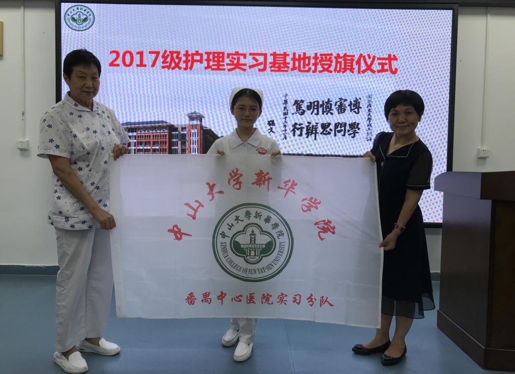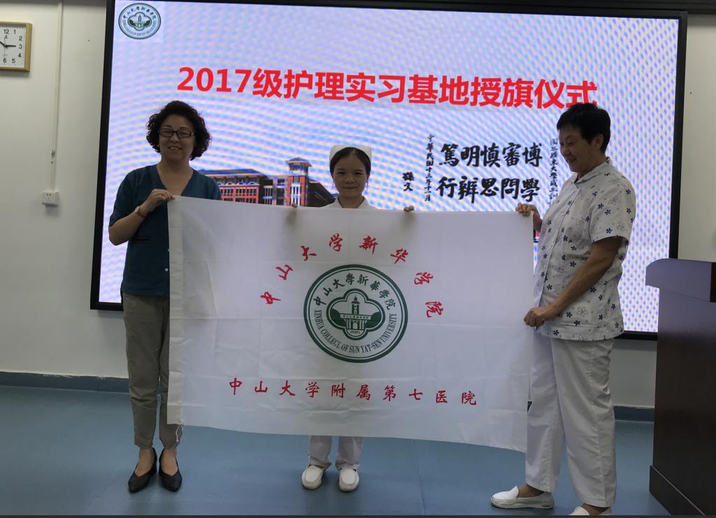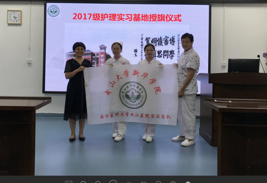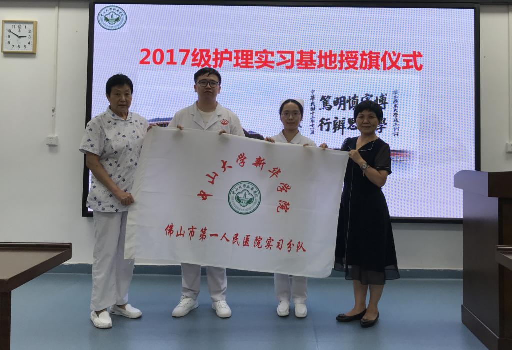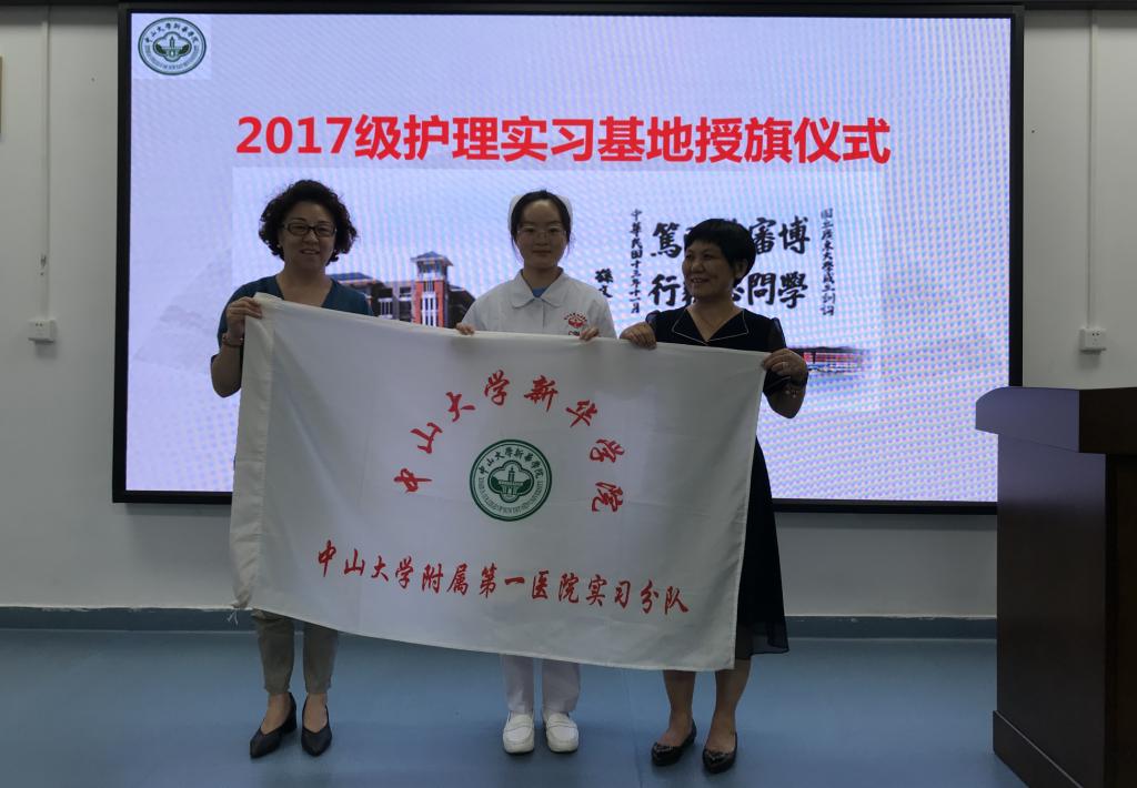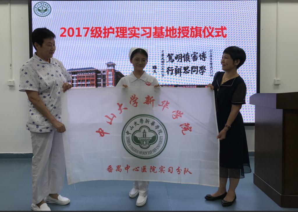 2020年7月8日下午,我院2017级护理实习基地授旗仪式在笃行楼护理实训中心示教室举行。我院执行院长王秀岚教授、于凤兰书记、魏萍督导、林丽娜老师及我院在汕头市中心人民医院、上海东方肝胆医院、中山大学附属第五医院、中山大学附属第三医院粤东医院、佛山市第一人民医院、中山大学附属第七医院、中山大学附属第八医院、广东省人民医院、番禺中心医院、佛山市第二人民医院、中山大学附属第一医院、中山大学附属第一医院惠亚医院、广东药学院附属第一医院、南方医科大学珠江医院等14家医院实习的各实习分队组长出席了此次授旗仪式。
