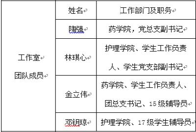 “+药护航”辅导员工作室(大学生学业和科技学术实践指导工作室),是中山大学新华学院成立的第一批辅导员工作室,目前我校辅导员工作室共有8个。本工作室由从事一线工作的5名辅导员组成,包括药学院和永利集团3044欢迎你专职辅导员3名,药学院党总支副书记1名,药学院学生工作负责人1名,永利集团3044欢迎你学生工作负责人、学生党支部副书记1名,六位成员其中4名均有硕士研究生以上学历,3年以上工作经验的辅导员有3名。