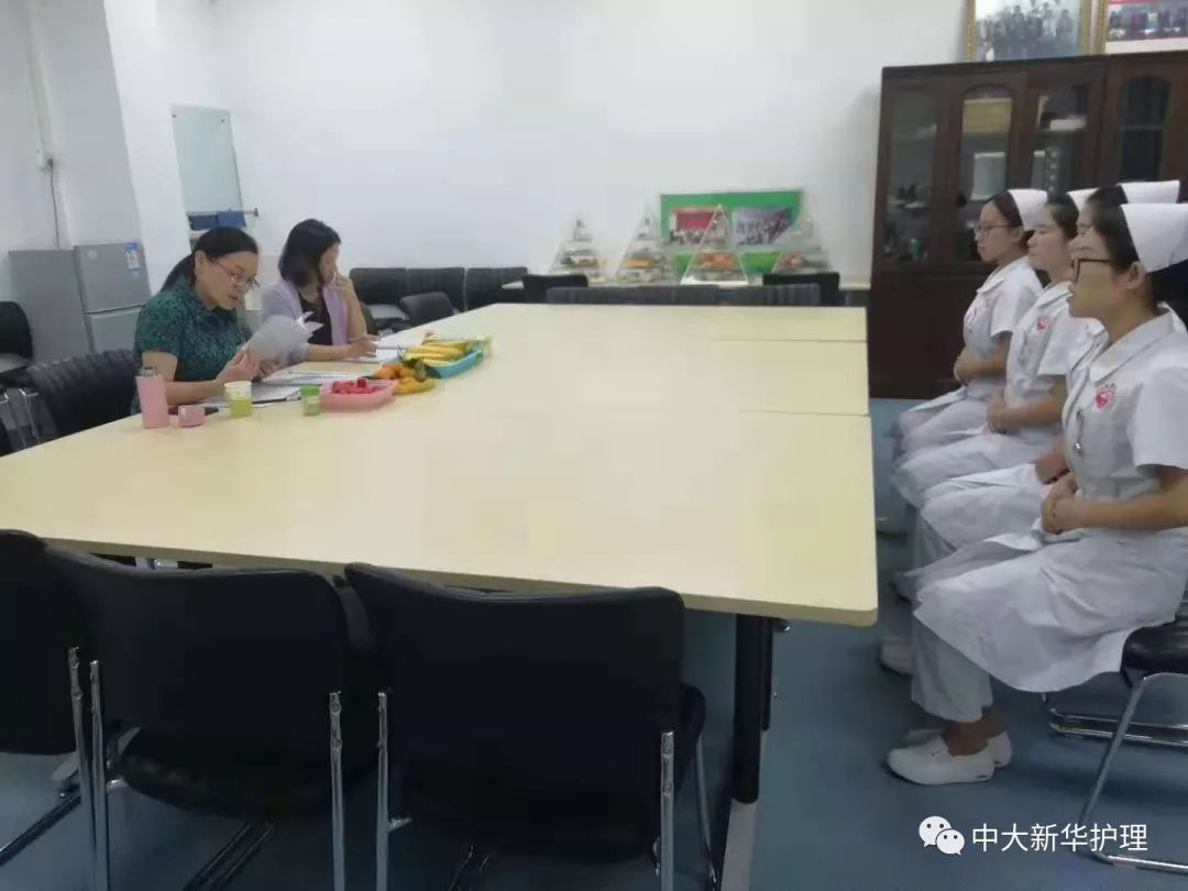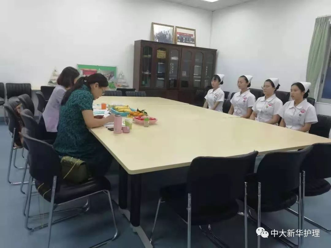 面试开始,面试的同学四人一组有序进入面试室,他们首先向护长们递交简历,列队问好,依次开始自我介绍,向护长们介绍自己姓名,性格,特长,学习成绩、参与的校内校外活动及去医院见习的相关经历。