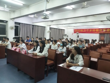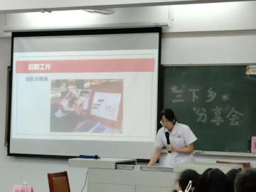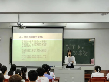 在主持人钟瑶琪的主持下,“三下乡”经验分享会拉开序幕。主讲人邱若然从什么是“三下乡”、为什么要参加“三下乡”、“三下乡”流程与须知几个方面展开宣讲。