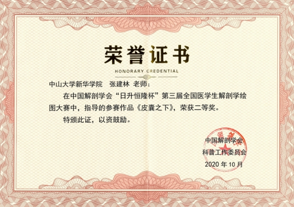 近日,第三届全国医学生解剖绘图大赛在生命奥秘博物馆落下帷幕。经过紧张激烈的专家评审和网络投票,我校永利集团3044欢迎你2018级学生肖思阳同学的作品《皮囊之下》(指导老师:张建林教授)在本次“日升恒隆杯”竞赛中获得二等奖,成绩喜人。