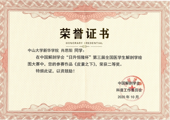 “日升恒隆杯”全国医学生解剖绘图大赛作品竞赛是由中国解剖学会科普工作委员会共同主办。本届解剖绘图大赛共收到全国180多所院校,累计2000余幅作品。经过第一轮专家评选,选出50部作品进入网络投票和专家评审,经过激烈角逐,我院肖思阳同学的作品获得二等奖。大赛充分调动了当代大学生参与解剖学绘图的积极性,激发了同学们对医学学习的兴趣。