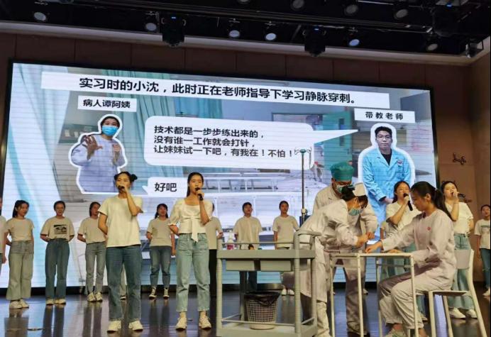 各校实习生陆续表演精心准备的节目。演出现场气氛热烈。我院实习护生表演了情景剧合唱《你曾是少年》。