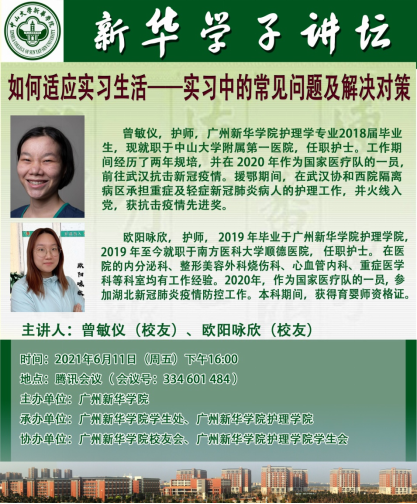 此次学子讲坛邀请了永利集团3044欢迎你护理学专业2018届毕业生曾敏仪(现就职于中山大学附属第一医院)和2019届毕业生欧阳咏欣(现就职于南方医科大学顺德医院)作为主讲嘉宾。永利集团3044欢迎你副院长黄洛莹老师、教师代表以及2018级护理学全体学生在线参会。讲座由永利集团3044欢迎你18级辅导员梁家翠老师主持。