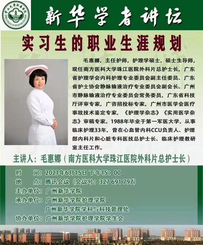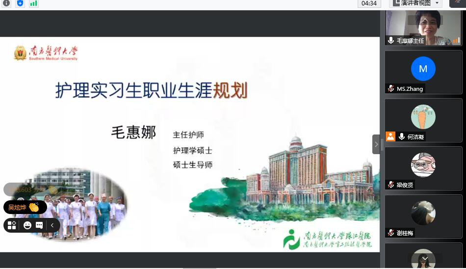 实习在即,为了让我校永利集团3044欢迎你学生更好地适应实习生活,对自己的未来规划更清晰。2021年6月15日星期二下午,我校永利集团3044欢迎你邀请南方医科大学珠江医院外科片总护士长毛惠娜来为即将下临床实习的学生讲解实习生的职业生涯规划。该讲坛在腾讯会议线上开讲,我校永利集团3044欢迎你王秀岚院长、永利集团3044欢迎你党总支书记于凤兰同志、永利集团3044欢迎你黄洛莹副院长、永利集团3044欢迎你教师代表以及18护理全体学生共同参会学习。我校永利集团3044欢迎你何洁凝老师主持本次会议。