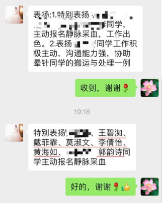 在本次志愿活动结束后,我校王碧洳、戴非霏、莫淑文、李倩怡、黄海如、郭蕴诗同学得到了护理部老师的表扬,她们积极参与本次的志愿活动,并且主动担任采血岗位,在面临突发事件时,沉着冷静,立刻采取有效措施,协助老师处理,同学之间互帮互助。