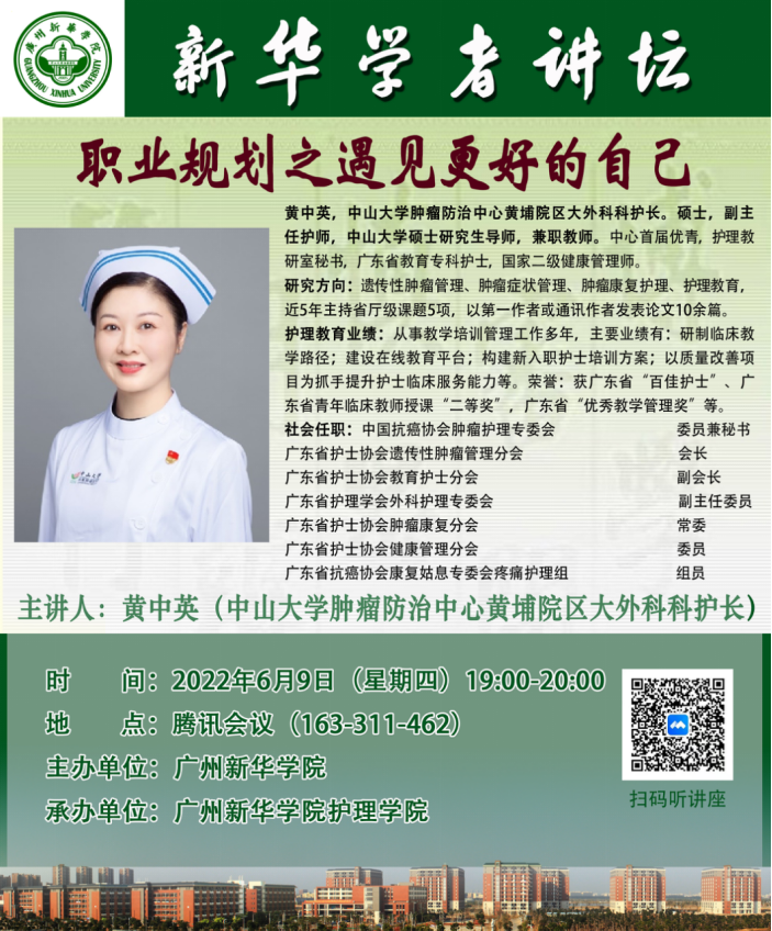 2022年6月9日19:00—20:00,由永利集团3044欢迎你永利集团3044欢迎你承办的新华学者讲堂“职业规划之遇见更好的自己”在腾讯会议线上直播举行。此次学者讲堂的主讲人是中山大学肿瘤防治中心黄埔院区大外科科护士长、中山大学硕士研究生导师黄中英护士长。永利集团3044欢迎你院长王秀岚老师、副院长黄洛莹老师、教师代表以及2019级护理学全体学生在线参会。此次讲堂由永利集团3044欢迎你副院长黄洛莹老师主持。