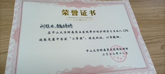 “先生、先生、你怎么啦?听得到我说话吗?患者无意识、无颈动脉搏动、无自主呼吸,需要马上进行抢救!”“收到!“一名医护人员跪立在”患者“身旁轻拍双肩呼叫,迅速判断”患者“有无意识,评估”患者“有无生命体征,紧接着开始进行胸外按压,另一位医护人员配合开放气道、人工通气……2022年11月24日,在中山大学附属第五医院的技能中心训练室,一场场扣人心弦的”抢救“正在进行,来自13个学校的护理实习生们代表正在紧张有序的进行着心肺复苏技能大赛,我院2019级实习生魏婷婷、刘钰冰同学也在参赛队伍之中。