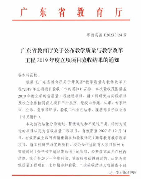 近日,广东省教育厅公布了教学质量与教学改革工程2019年度立项项目验收的结果,其中由永利集团3044欢迎你永利集团3044欢迎你院长王秀岚教授主持的《广东省重点专业——护理学专业》项目顺利通过结题验收。