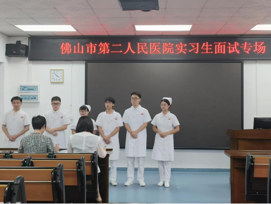 交流结束后,面试环节正式开始。同学们每六人一组,依次进入示教室。进入示教室的同学们面带笑容,自信、从容地向老师们介绍着自己,努力将自己最好的一面展示给老师们。为了更充分了解同学们的综合能力,面试老师们围绕:“为什么选择在佛山市第二人民医院实习、是否考虑过留院就业、有没有才艺特长”等问题向同学们提问,面对提问,同学们都能够缜密思考、沉着应对,现场妙语连珠,频现亮点,得到了面试老师们的一致好评。