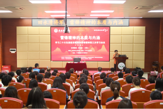 田永清将军多年来不断学习和践行雷锋精神,他认为雷锋精神的核心是全心全意为人民服务。他从五个方面阐述雷锋精神:即感恩、敬业、助人、克己、勤学。第一,是感恩。田将军讲述了雷锋“苦孩子,好战士”的经历,阐述了为什么雷锋感恩毛主席,感恩共产党,感恩解放军,感恩新社会,感恩关心过、帮助过他的一切人。第二,是敬业。雷锋参军前是好农民,到鞍钢成为好工人,参军后成为好战士。雷锋真正做到了干一行爱一行、干一行钻一行、干一行专一行。第三,是助人。“雷锋出差一千里,好事做了一火车”,田将军分享的雷锋乐于助人的故事感染了同学们。第四,是克己。雷锋严以律己,时时处处事事严格要求自己。田将军引用习近平总书记的话语——“雷锋精神,人人可学。奉献爱心,处处可为”来勉励同学们向雷锋学习。第五,是勤学。田将军提到,雷锋还有一个很突出的优点,就是爱学习、爱看书,并提到这是雷锋成为大家学习的光辉榜样的重要原因。田将军结合现在很多同学手机不离身,爱玩手机不爱看书的现象,鞭策同学们应该要警惕不良习惯,学习雷锋爱读书、爱学习的好习惯。