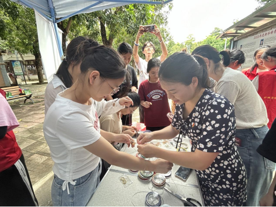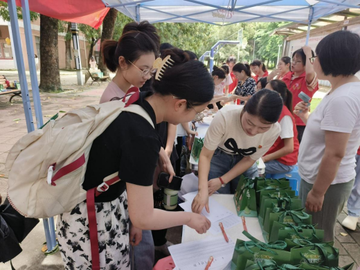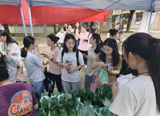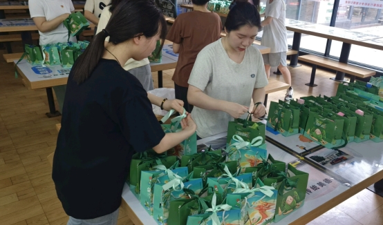 活动伊始,老师与志愿者们在饭堂分装礼品,分装完毕后,各式各样的端午礼品被摆上了摊位。师生们向前来领取礼品的同学们热情地介绍端午节的习俗及礼品的寓意,为他们送上独特的端午祝福,活动现场气氛热烈而温馨。