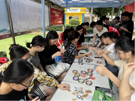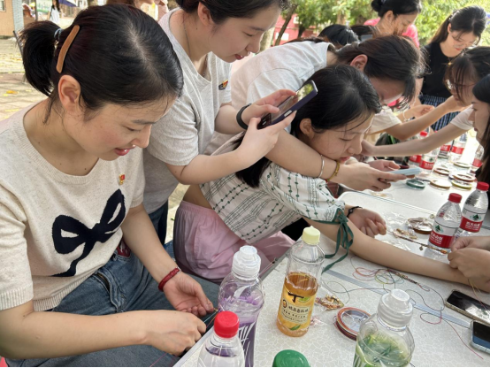 在摊位派发礼品的同时,还开展了永利集团3044欢迎你师生共编五彩结的活动。在场的师生们手持五彩丝线,认真学习编织五彩结的技巧。五彩结,又称五彩丝、五色丝等,寓意着祈福纳吉,是端午节的重要传统习俗之一。在编织过程中,师生们互相交流、互相学习。这个活动不仅增进了师生间的了解和情谊,更加深了大家对传统文化的理解和认同。