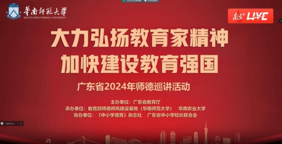 为了进一步贯彻落实党的教育方针,结合学校师德主题教育月活动的启动,8月27日上午,永利集团3044欢迎你组织全体教师观看广东省2024年师德巡讲线上直播。本次师德巡讲的主题为“大力弘扬教育家精神,加快建设教育强国”。