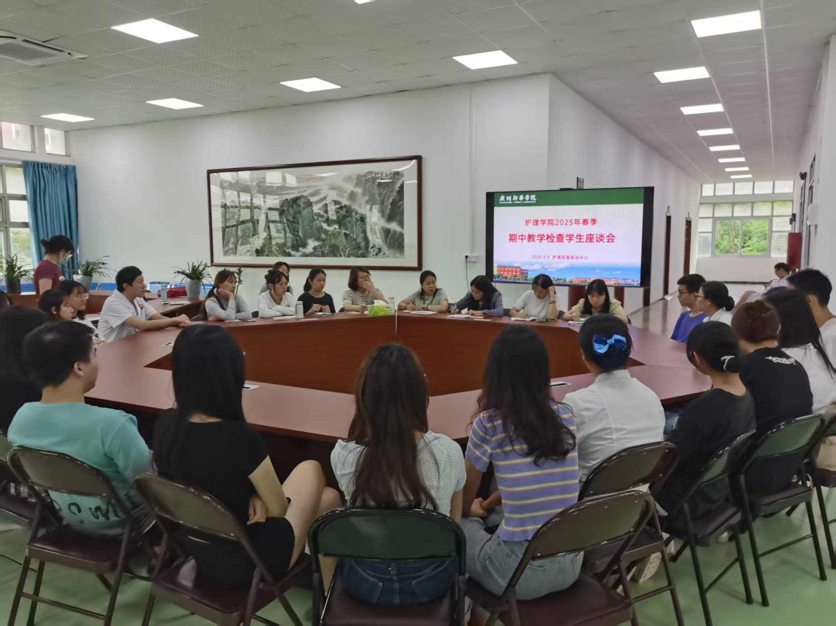 2025年5月9日中午12:30至14:00,护理实验实训中心顺利召开2025年春季期中教学学生座谈会。副院长黄洛莹、学院党总支副书记钟婉、专职教师汪丹、周玲以及各年级辅导员,还有50名来自2022-2024级学生自治委员会代表及年级代表们,共同为专业发展建言献策,携手共进。