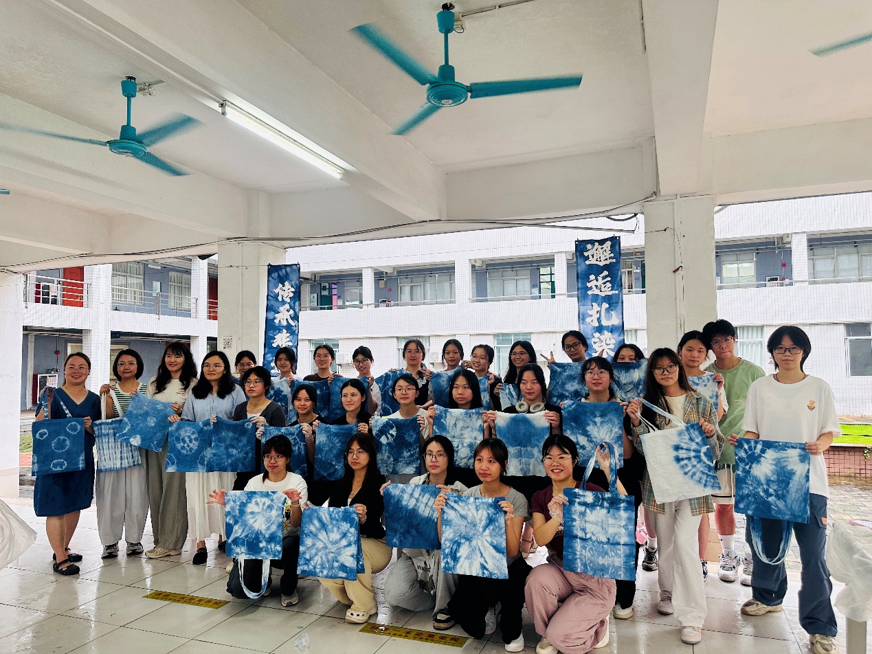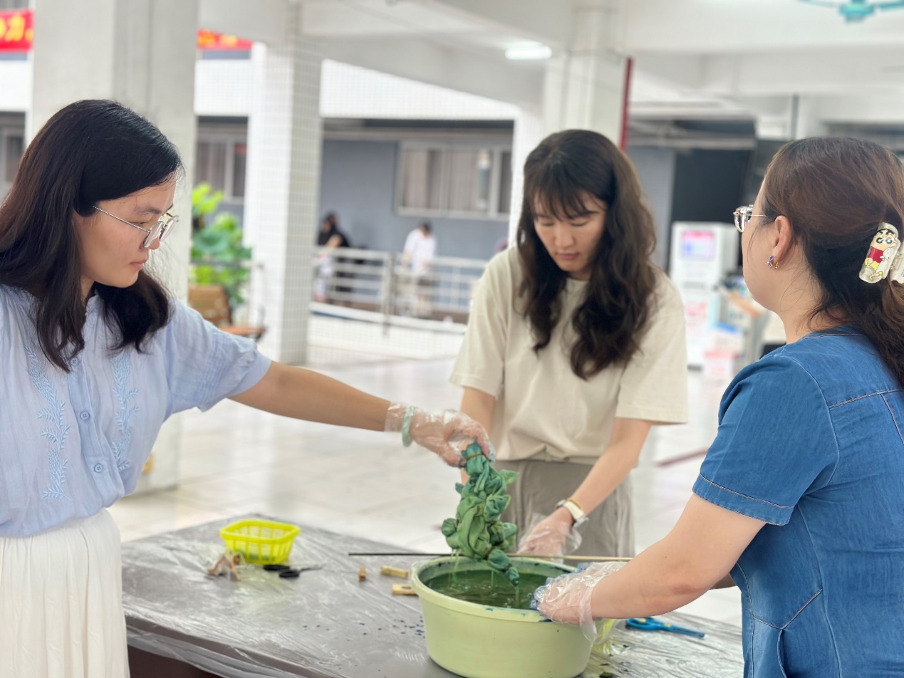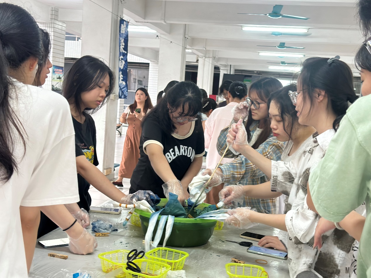 在实践环节中,大家充分发挥想象力,通过折叠、捆绑、染色等步骤,将一块块素白的布料变成独一无二的艺术品。活动现场欢声笑语不断,师生们互相交流技巧,分享心得,氛围温馨而热烈。