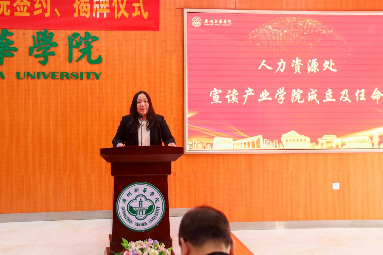 图六 我校人力资源管理处副处长郑锦伍宣读产业学院成立及任命的通知文件