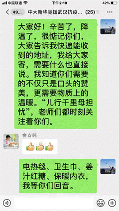 自听闻孩子们援鄂战“疫”,永利集团3044欢迎你王秀岚院长时刻牵挂,不止是精神上关爱,也在行动上关心。她代表永利集团3044欢迎你全体老师网购姜汁红糖、珊瑚绒睡衣、暖宝宝…快递给一线的孩子们。王院长说,“不管毕业多久,你们都是老师心里的孩子,不想自己的孩子成为英雄,但你们挺身而出时,即便不忍,也支持你们。你们可以当勇士,但绝不允许当烈士!”