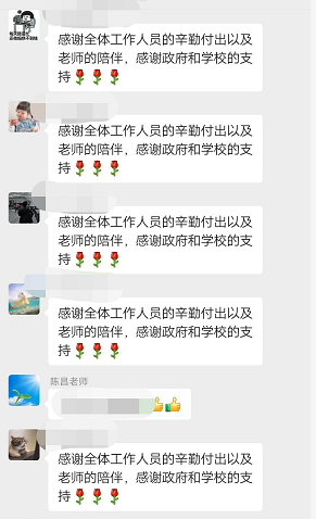 为了确保工作的顺利进行,小组负责人陈昌老师第一时间召集大家召开小组工作会议,确定了小组的工作方案和小组成员的具体分工。这几天以来,小组成员每天通过微信群以及电话实时关注每位学生的身体状况,处理突发事件以及对学生进行心理疏导,排除学生恐慌、焦虑等不良情绪,更好地帮助他们减轻疫情带来的心理伤害,让学生在疫情防控中坚定信心,共克时艰!隔离不隔爱,陪伴学生顺利渡过隔离期。